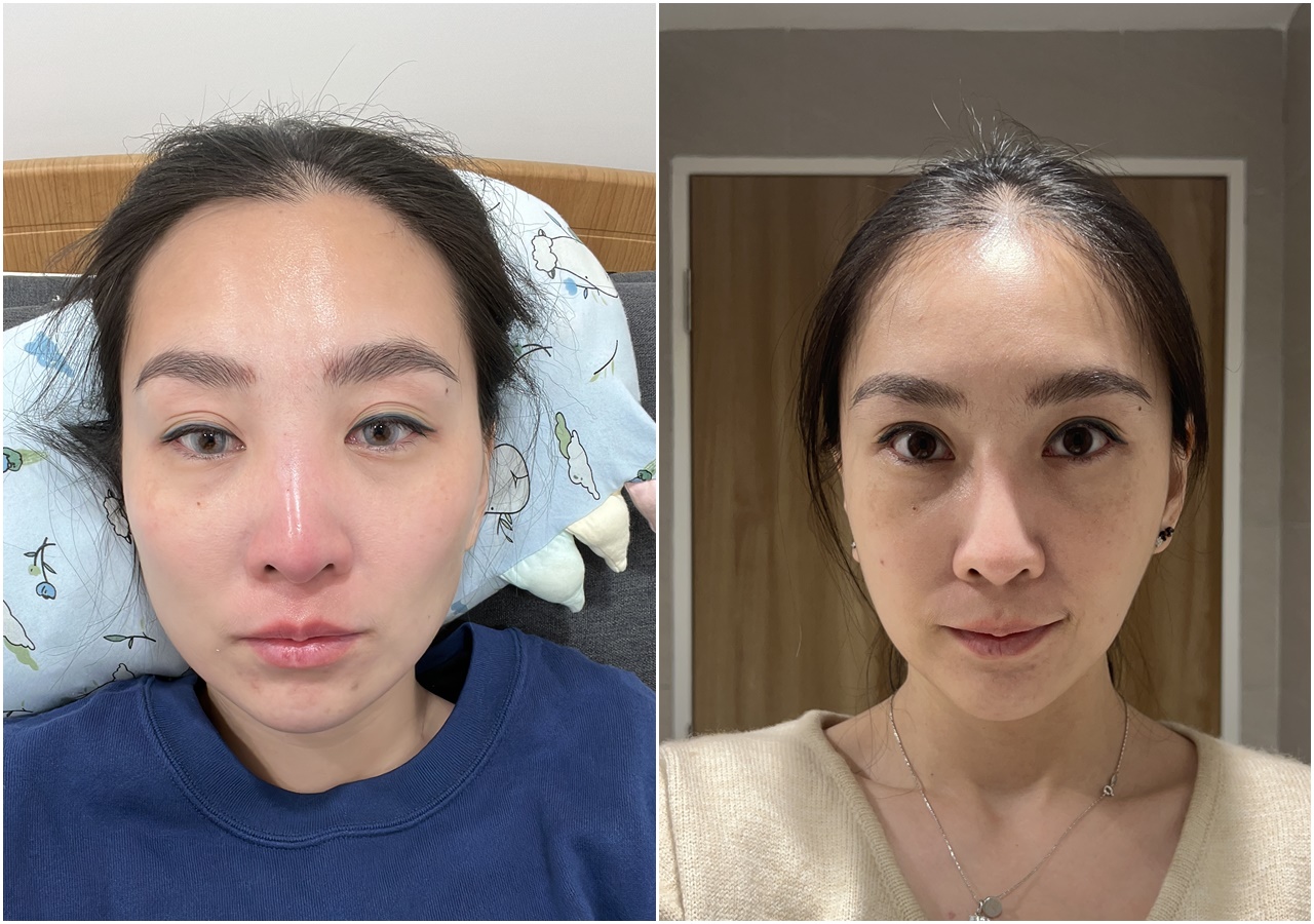 Di bulan pertama ini, aku sudah bisa melihat garis wajah yang mulai membentuk V-line lebih halus, dan hidungku tampak lebih ramping tapi tetap natural, gak meruberubah wajah total, justru seperti versi refined dari diriku sendiri. Walaupun, bengkak besarnya masih bisa kelihatan, tapi ini udah jauh lebih baik dari sebelumnya.